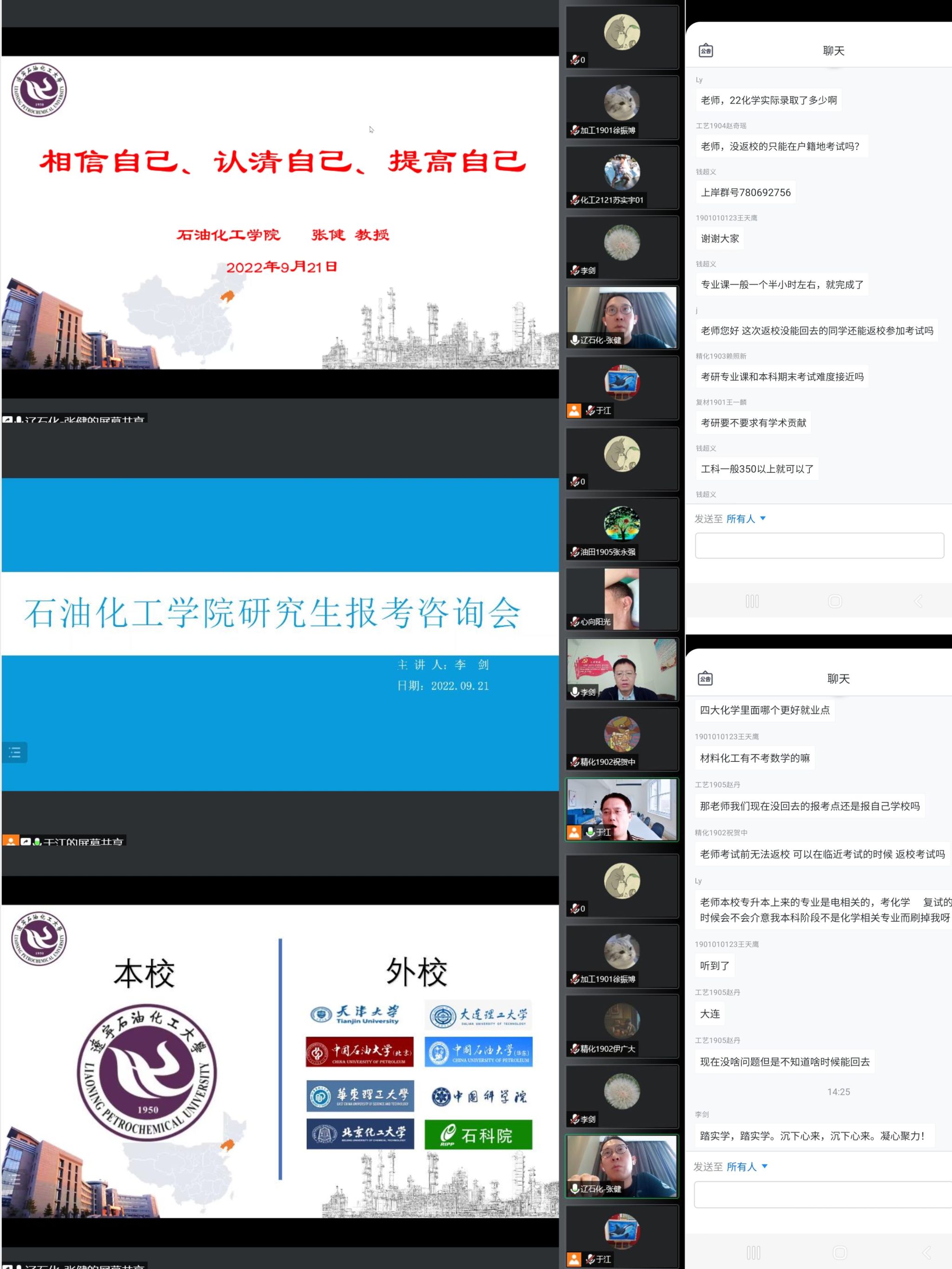最后,两位主讲希望每个学生要认清自己,做好规划,明确方向。现阶段一定要踏踏实实学习,争取每日提一分,这样考试来临时我们才能够从容面对。石化学院研究生工作还将采用多种方式持续为考生提供各种咨询、指导和服务,助力更多考研的毕业生成功上岸。