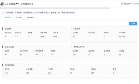 本次线上视频双选会是面向2023届毕业生的秋季综合类大型线上招聘会,共邀请到茂名瑞派石化工程有限公司、北京天罡助剂有限责任公司、中国平安人寿保险股份有限公司、北京康吉森自动化技术股份有限公司等161家用人单位参会,其中包括科研院所、国有企业、民营企业、三资企业,提供岗位716个,招聘9044人,会议浏览量达8954次,吸引了化学工程与工艺、应用化学、能源化学、油气储运、高分子材料等专业应届毕业生735人参与咨询、投递简历以及签订就业意向书。据统计,用人单位邀约566人次,求职简历投递1348人次,达成就业意向签约11人次。在环境与安全工程学院、国际工程学院、创新创业学院、研究生院的配合下,会议安排精准周密,推进平稳有序,获得用人单位与毕业生的欢迎与好评,取得良好成效。