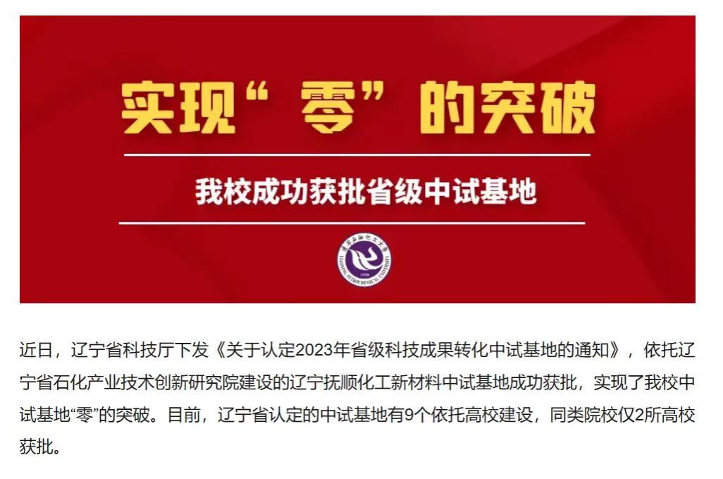 辽宁省科技厅下发《关于认定2023年省级科技成果转化中试基地的通知》,学院依托辽宁省石化产业技术创新研究院建设的辽宁抚顺化工新材料中试基地成功获批,实现了独播库 中试基地“零”的突破。目前,辽宁省认定的中试基地有9个依托高校建设,同类院校仅2所高校获批。