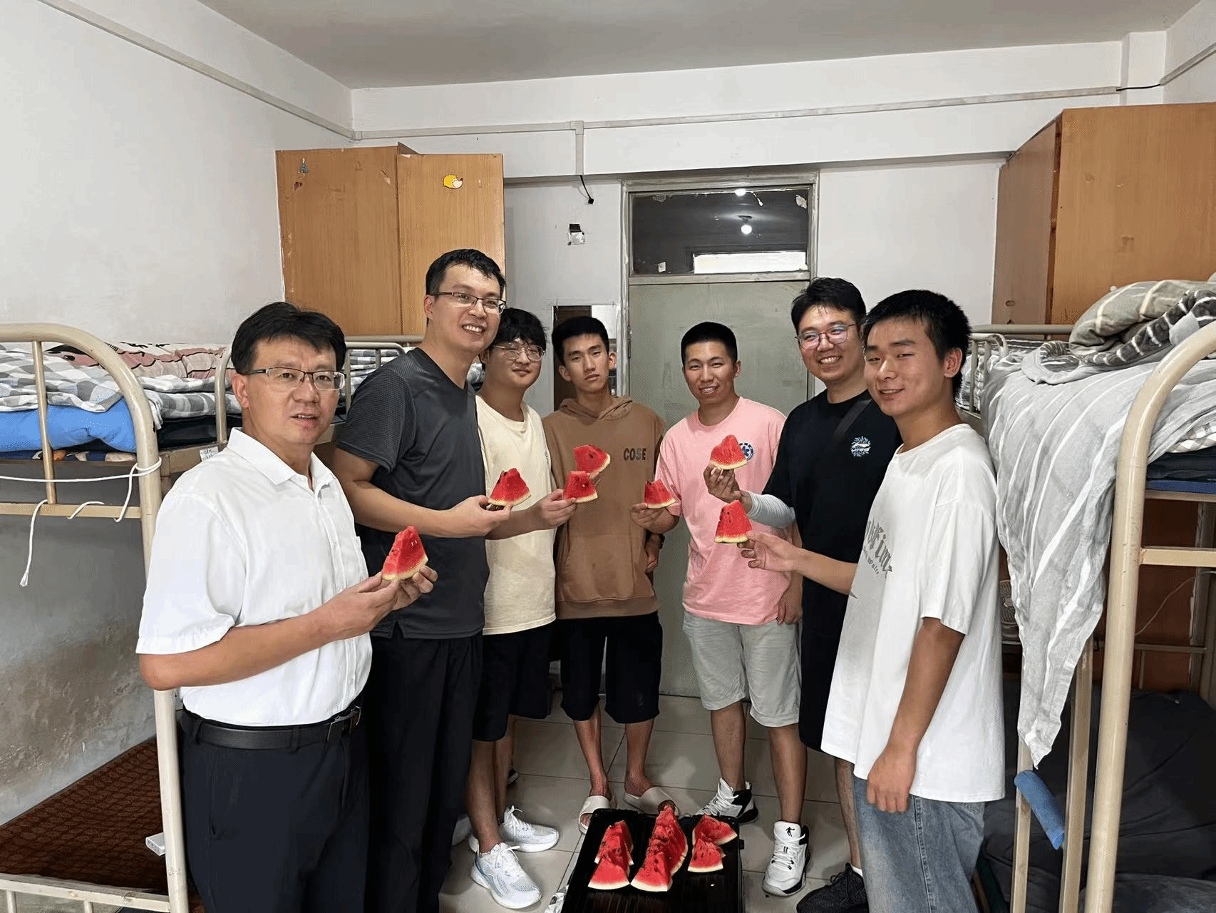 8月6日,学院党委书记张召鹏、副书记李勇、辅导员王一夫走进学生寝室,不仅送去了清凉可口的西瓜,更是在轻松愉快的氛围中与学生进行了面对面的座谈,倾听他们的心声,分享经验,鼓励他们在考研路上携手并进,共同迎接挑战,成就梦想。这无疑为炎炎夏日中的留校学子们送去了最清凉的慰藉与最坚实的力量。