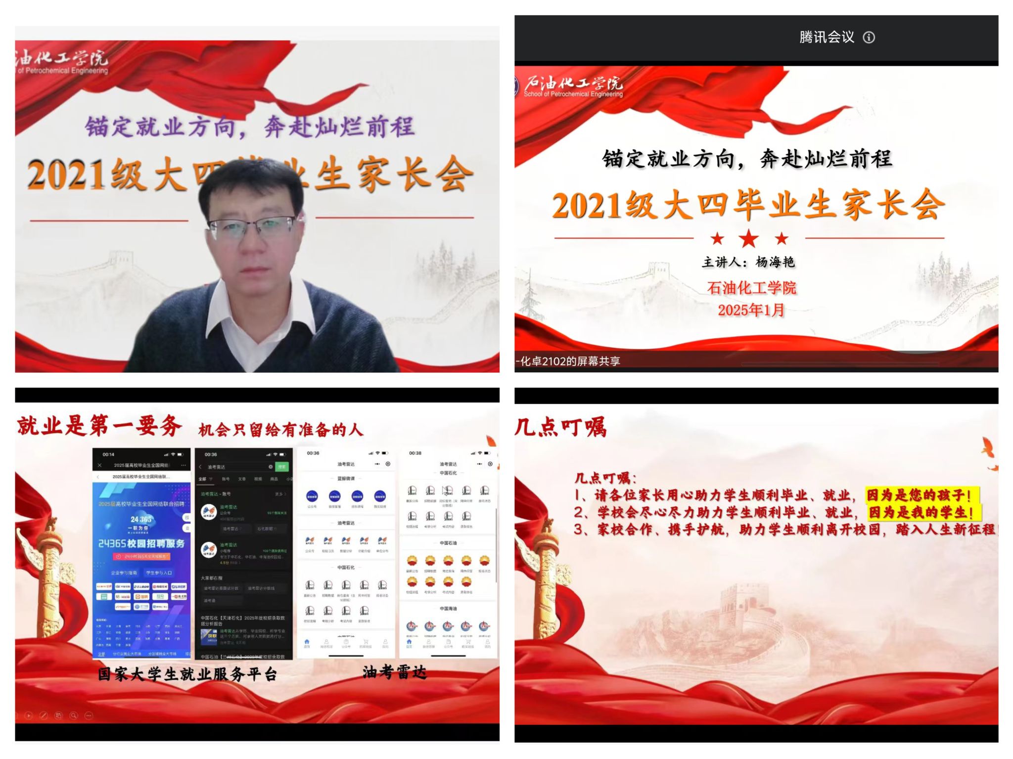 结合学院实际,各家访小组在传达学生学业和在校表现的同时,把就业指导和考研培训融入线上线下家访的全过程,切实提升学生在就业市场的核心竞争力。学院切实落实就业“一把手”工程,多渠道开展就业工作。一是召开两场毕业年级学生大会,李勇出席会议并讲话,全体毕业生及辅导员参加会议,会议旨在分析就业形势,讲明尽快就业的目的和意义,并线上解答毕业生提出的问题。二是各专业毕业班班主任及系主任、专业教师分班组织召开毕业班家长会,切实落实就业三包责任制。三是完善就业台账,辅导员、班主任重点联系班级未就业学生,了解学生就业意向及困难,辅导员更新完善以论文指导教师和班主任为“三包教师”的就业动态台账,共同发力,助力就业。