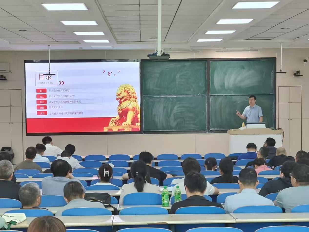 6月4日下午,学院党委书记张召鹏在第五教学楼101教室为全院党员讲授深入贯彻中央八项规定精神学习教育专题党课,学院全体党员参会。