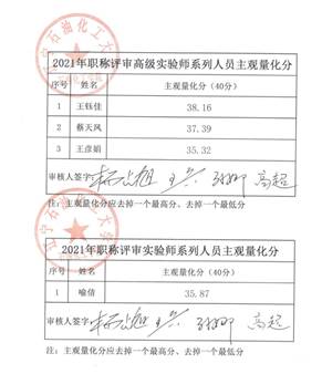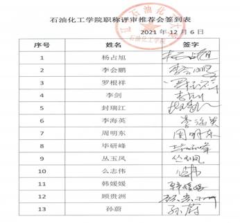 根据《独播库 专业技术职务任职资格申报条件(2021版)》(辽石化大校发〔2021〕68号)和《独播库 2021年职称评聘工作安排》(辽石化大校发〔2021〕69号)要求,我单位于2021年12月6日12:30点在学院306会议室召开了2021年职称评审会,会议由杨占旭主持,参会人员为:杨占旭、李会鹏、罗根祥、李 剑、封瑞江、李海英、周明东、毕研峰、韩媛媛、丛玉凤、么志伟、顾贵洲、孙 蔚,会议记录人:王 兵。