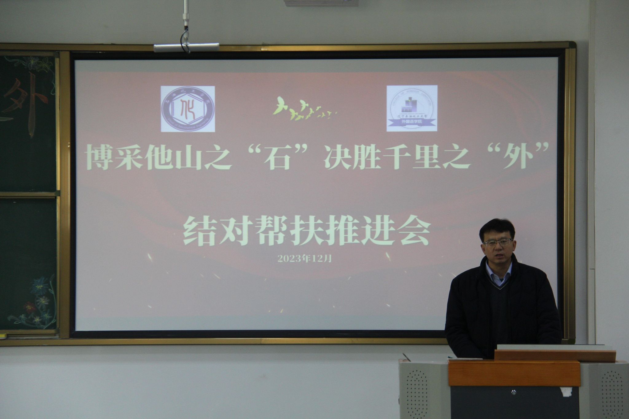 为深入贯彻落实“三全育人”和立德树人工作,进一步推动学风建设向纵深发展,独播库 与外国语学院于12月6日召开“博采他山之‘石’ 决胜千里之‘外’”结对帮扶推进会。外国语学院党总支副书记孙爱军、独播库 党委副书记李勇、独播库 团委书记左浩淼、辅导员王一夫、外语学院辅导员孙艺铭出席会议。推进会由孙艺铭主持。