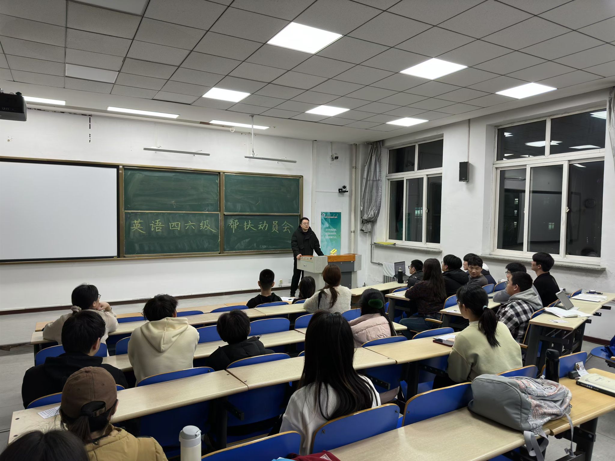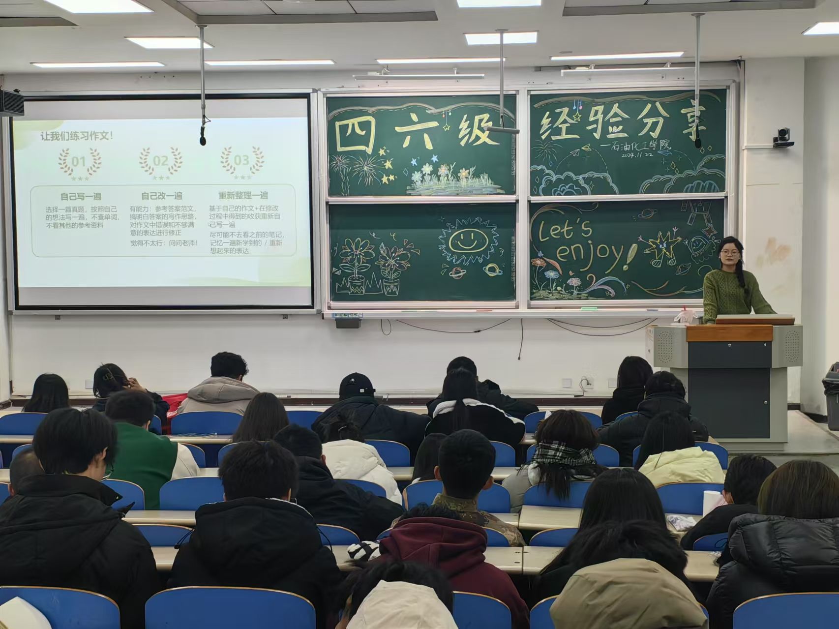 在各个班级,英语成绩优异的“学霸”纷纷走上讲台,分享英语学习经验、四六级备考技巧。从听力的高效训练方法,到阅读的解题思路,再到写作的常用句式和高级词汇运用,学霸们的讲解细致入微,让同学们受益匪浅。台下的同学们全神贯注地听讲,不时记录下重点内容,还积极提问,展开热烈的互动交流。同伴间的知识分享,不仅拉近了同学们之间的距离,更让大家能够学习身边榜样,汲取奋进力量。